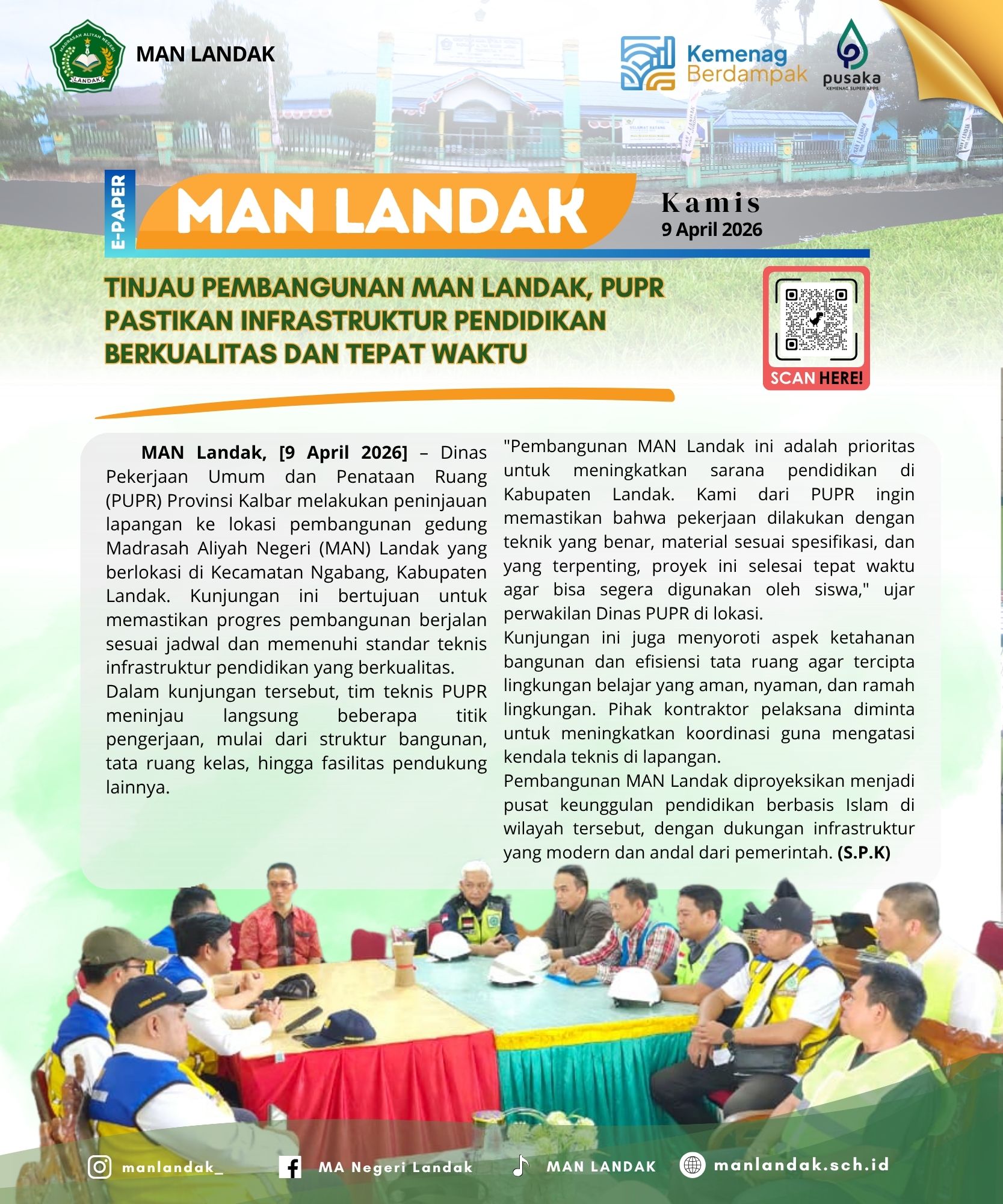 MAN Landak, [9 April 2026] – Dinas Pekerjaan Umum dan Penataan Ruang (PUPR) Provinsi Kalbar melakukan peninjauan lapangan ke lokasi pembangunan gedung Madrasah Aliyah Negeri (MAN) Landak yang berlokasi di Kecamatan Ngabang, Kabupaten Landak. Kunjungan ini bertujuan untuk memastikan progres pembangunan berjalan sesuai jadwal dan memenuhi standar teknis infrastruktur pendidikan yang berkualitas. Dalam kunjungan tersebut, … Baca Selengkapnya