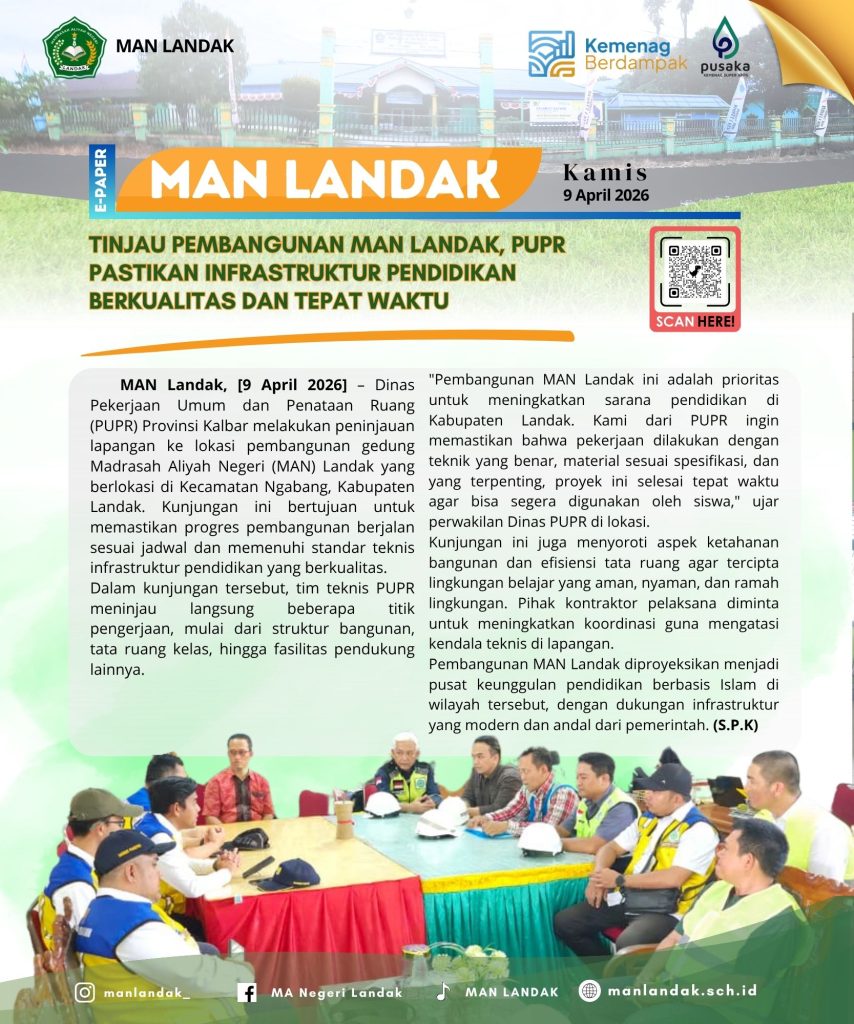 MAN Landak, [9 April 2026] – Dinas Pekerjaan Umum dan Penataan Ruang (PUPR) Provinsi Kalbar melakukan peninjauan lapangan ke lokasi pembangunan gedung Madrasah Aliyah Negeri (MAN) Landak yang berlokasi di Kecamatan Ngabang, Kabupaten Landak. Kunjungan ini bertujuan untuk memastikan progres pembangunan berjalan sesuai jadwal dan memenuhi standar teknis infrastruktur pendidikan yang berkualitas.